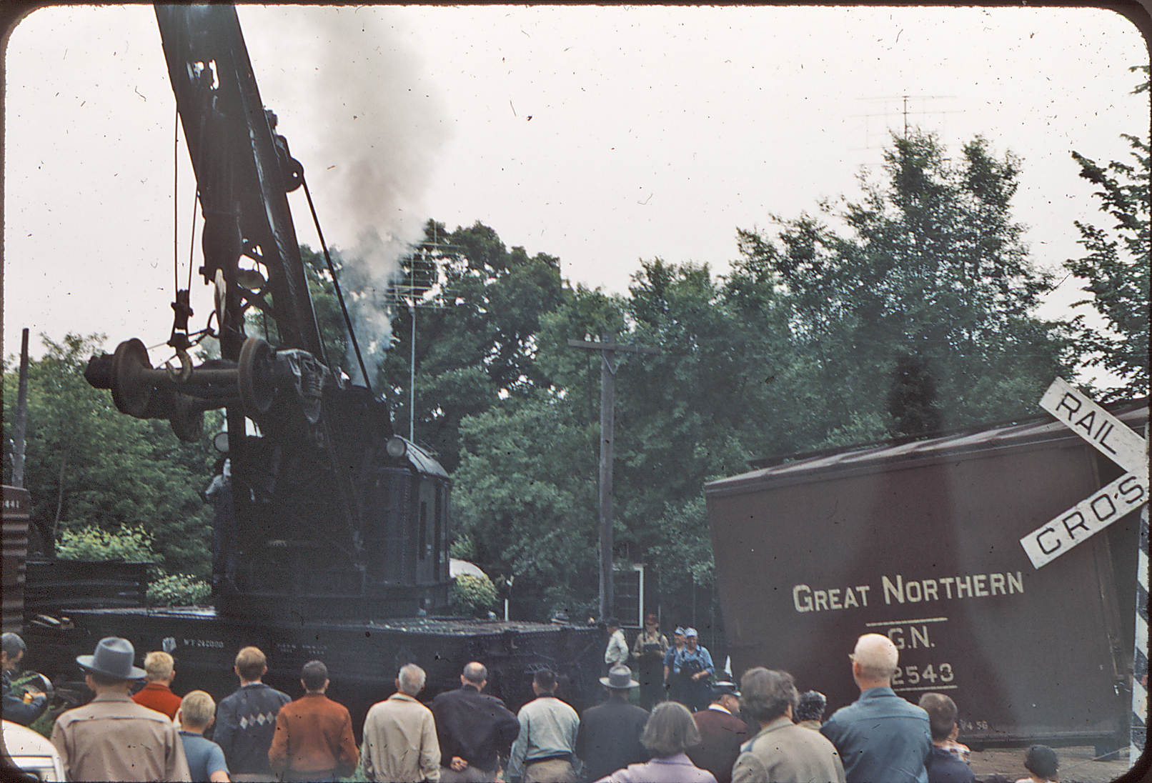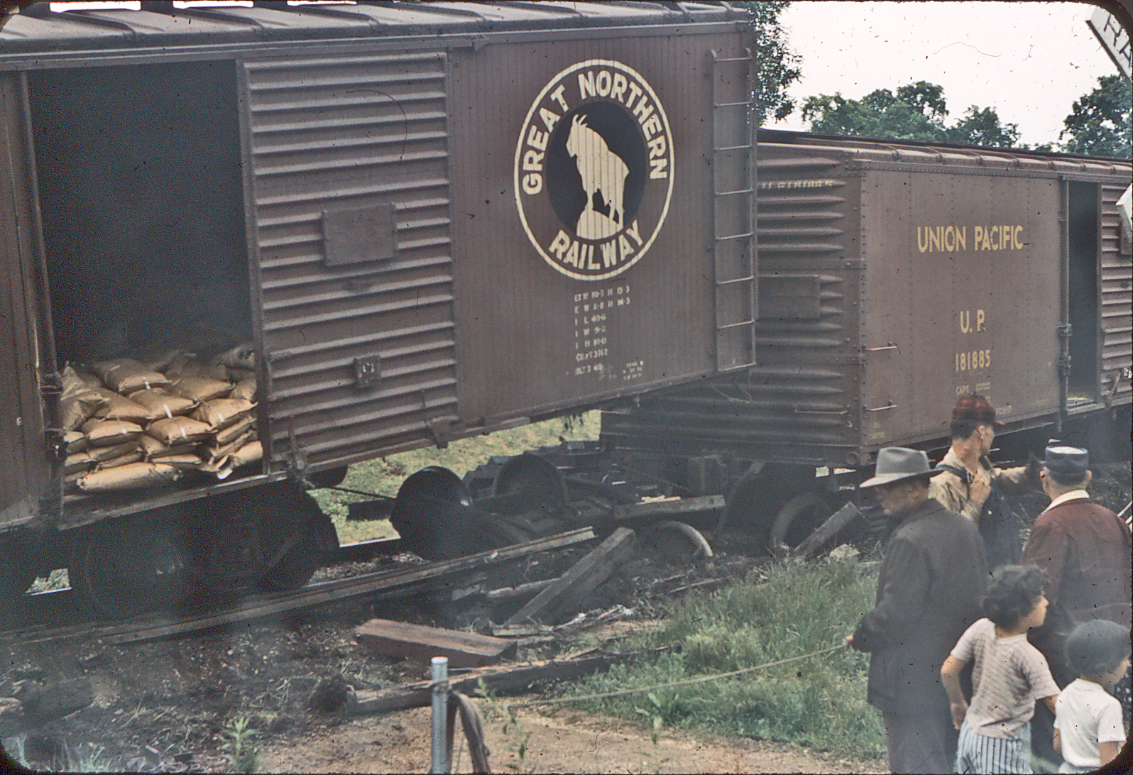 I wonder what the bagged commodity in the open Great Northern boxcar was. The car seems lightly loaded, which means that it was either a less-than-carload shipment, or that the lading gained legs and walked away after the derailment.