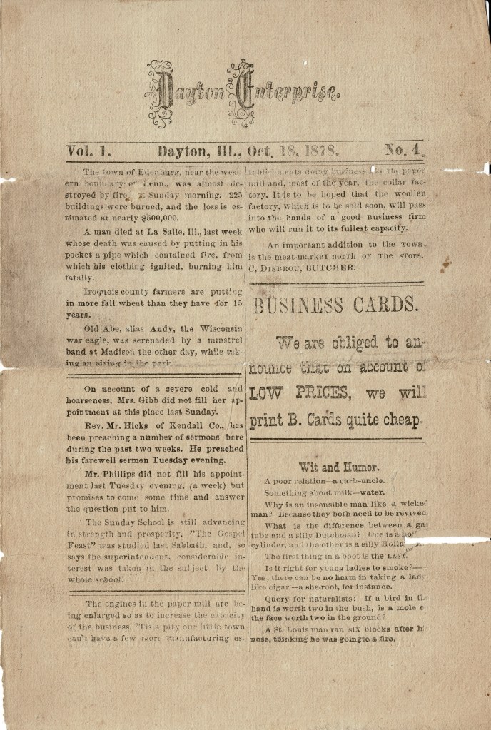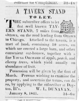 She lived in the town of Rutland something over a year when she removed to Dayton, being at this place at the time of the Black Hawk war in 1832. Of this war she says: “On the 16th of May, 1832, the girls and I were at the spring, near where the feeder bridge now stands, when Eliza came down on horseback and told us that the Indians were coming, and we would have to go to Ottawa immediately. Then we went to a place a couple of miles below Ottawa and stayed there all night, and the third day returned home again. This was Sunday, and the next day the men made a stockade around the house out of plank. After it was finished they tried it to see if a bullet would go through it, and as it did, they hung feather beds all around. There were about sixty people here at the time, and we were so crowded that they had to sleep on tables, under the beds and all over the house.”
