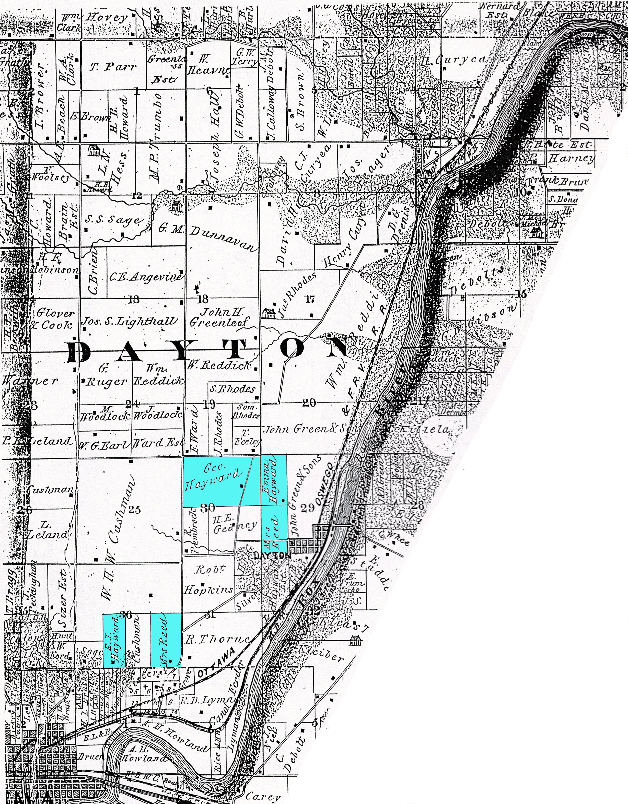 Charles Hayward was born April 8, 1808 and grew up in Lebanon, Connecticut. He moved to Cleveland, Ohio, in 1818, and in 1835 or 36 he moved to La Salle County, one of its oldest settlers. He bought farmland, some of which was in Dayton township (highlighted above). In addition to farmland he also owned lots in Ottawa, Peru, Marseilles, and La Salle.