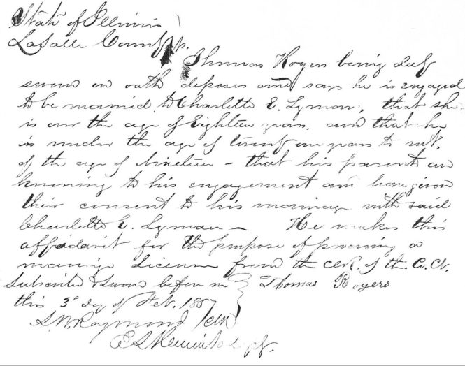 On February 3, 1857, Charlotte Lyman and Thomas Rogers applied for a marriage license. Charlotte was over 18 and therefore of legal age to marry, but Thomas was only 19 and had to file an affidavit that his parents knew about the engagement and gave their permission for the marriage. They were married two days later, on February 5th. The marriage was performed by John Read, J. P., in La Salle county, Illinois.