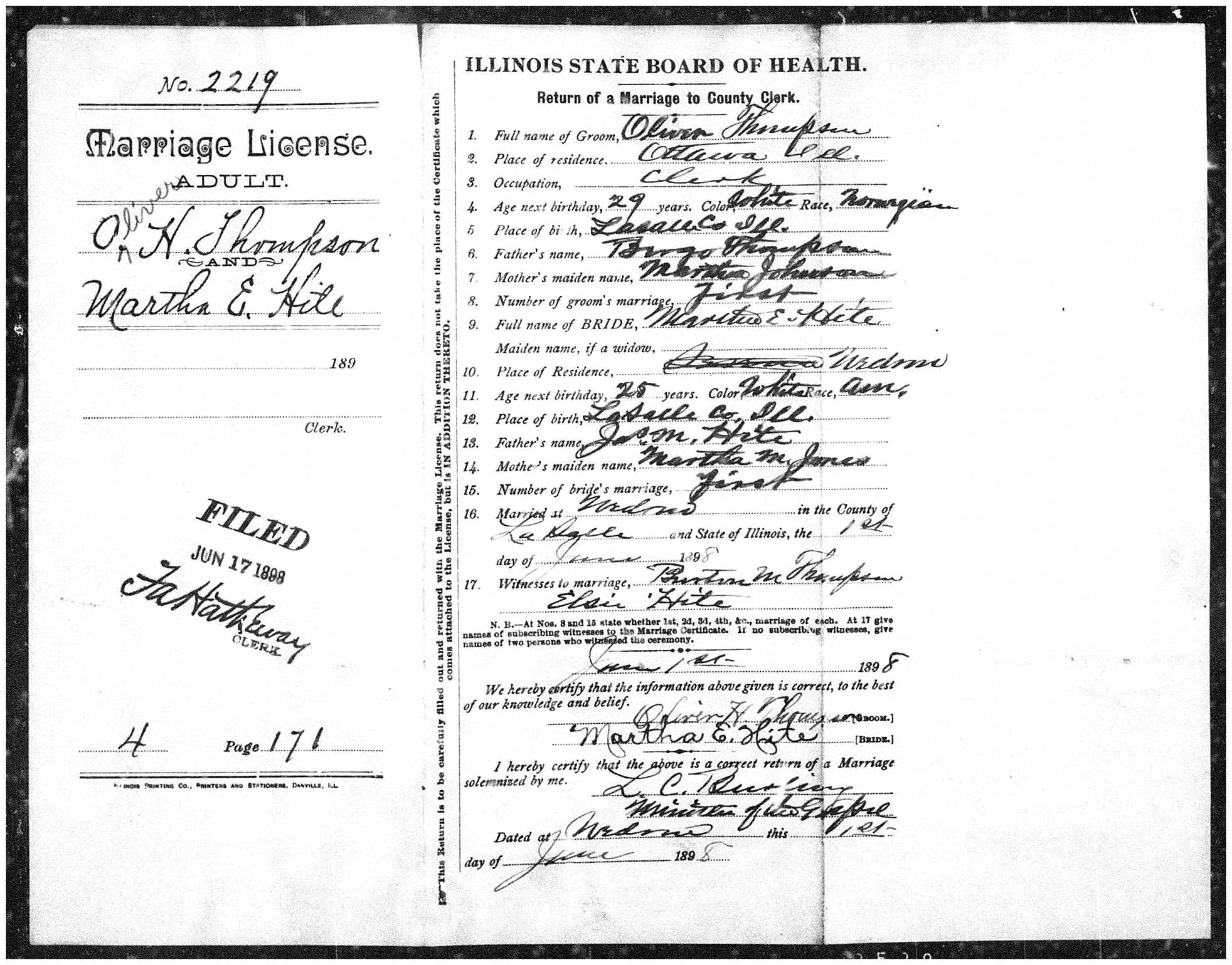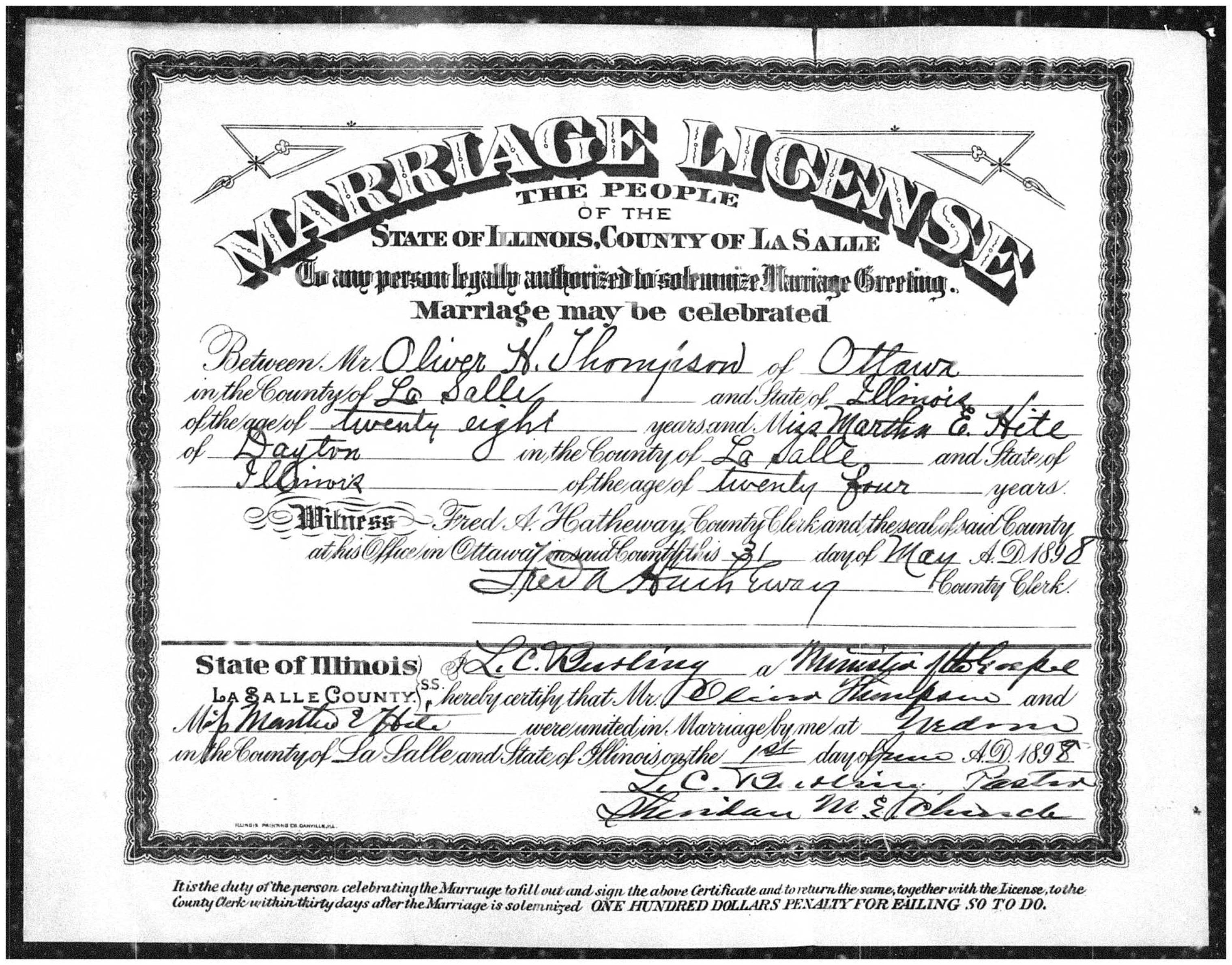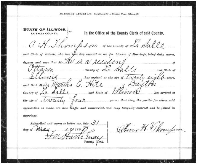 On the 31st of May, 1898, Oliver Thompson and Martha Hite appeared at the La Salle County Clerk’s office in Ottawa to apply for a marriage license. Oliver signed an affidavit that both of them were of legal age to marry.