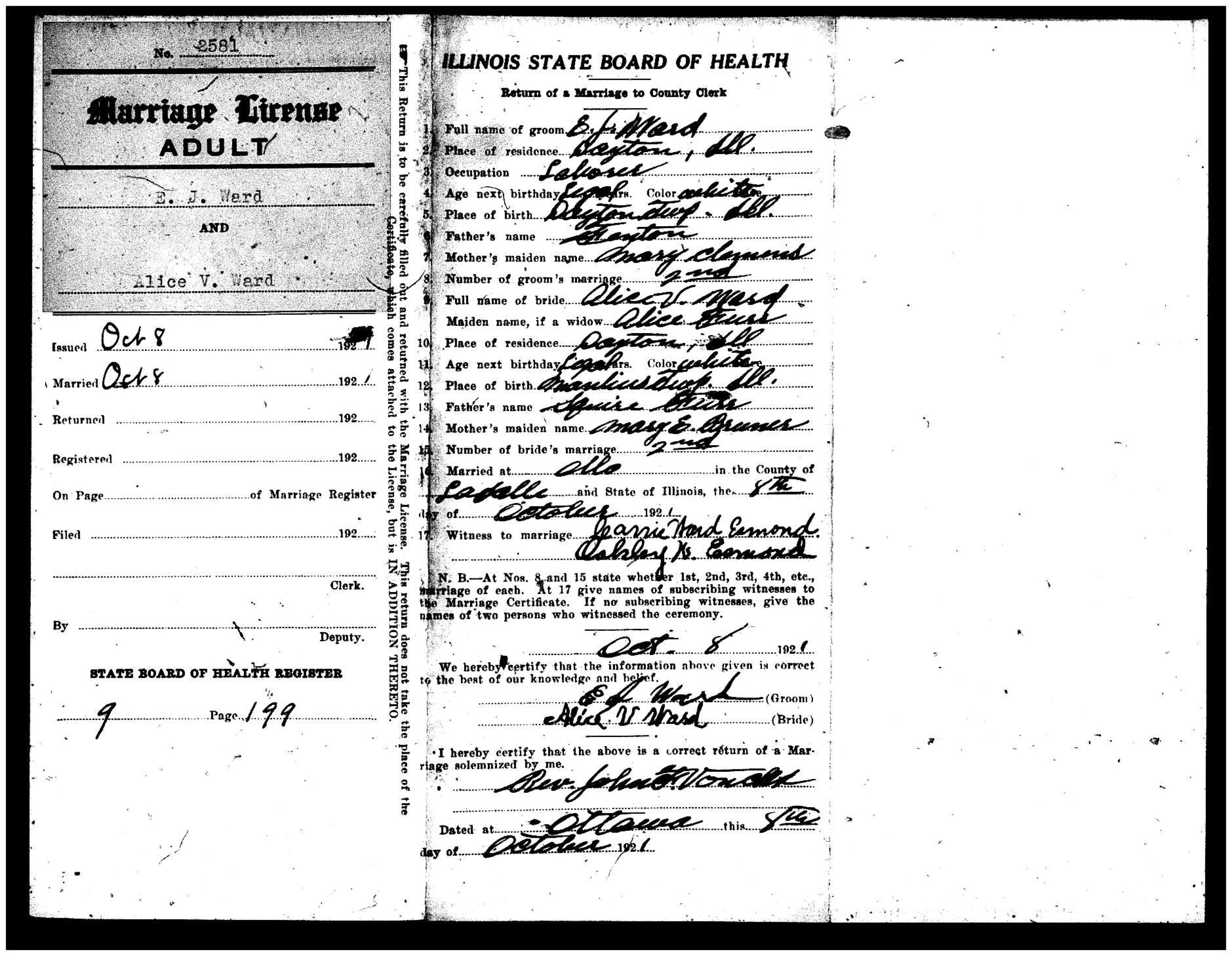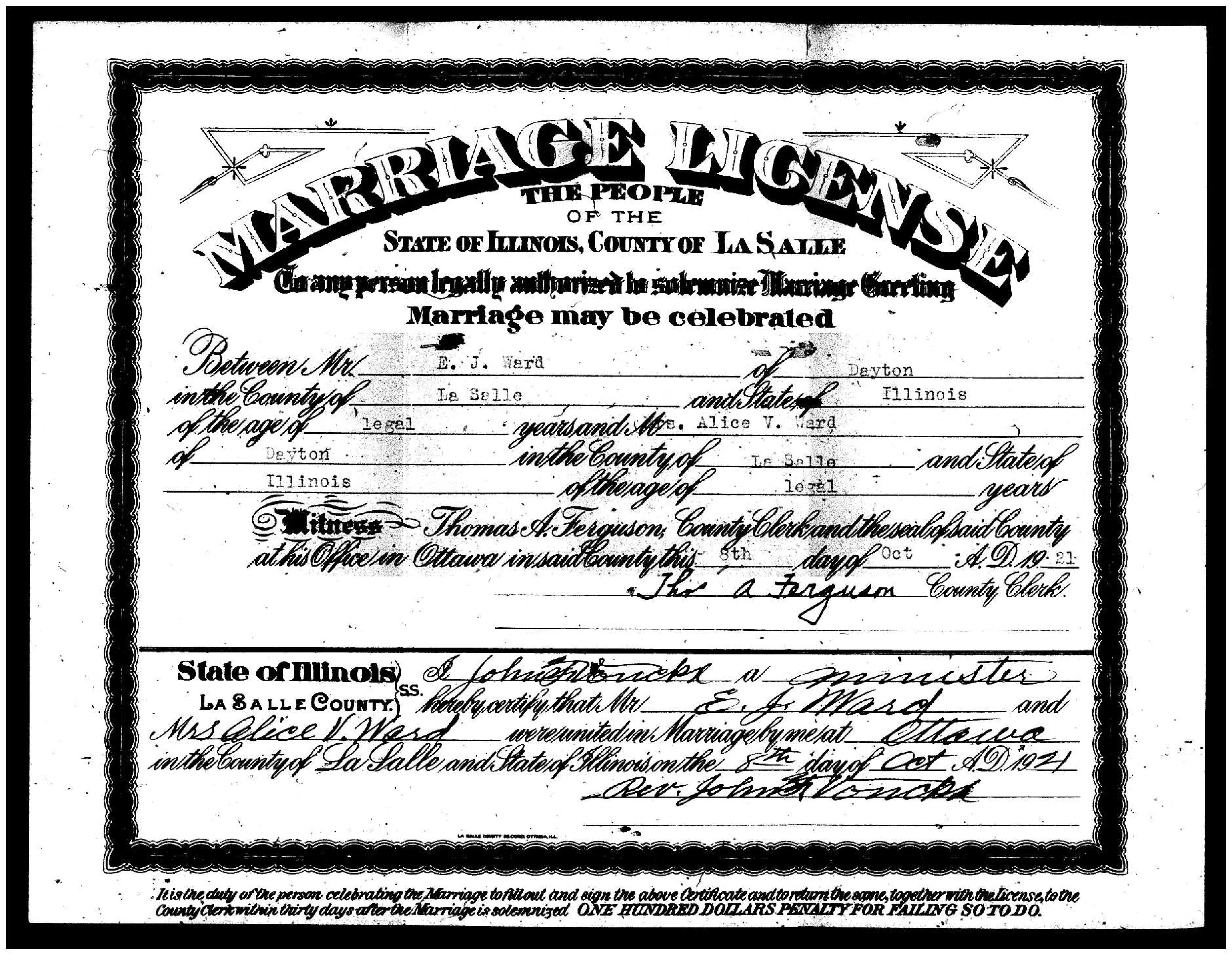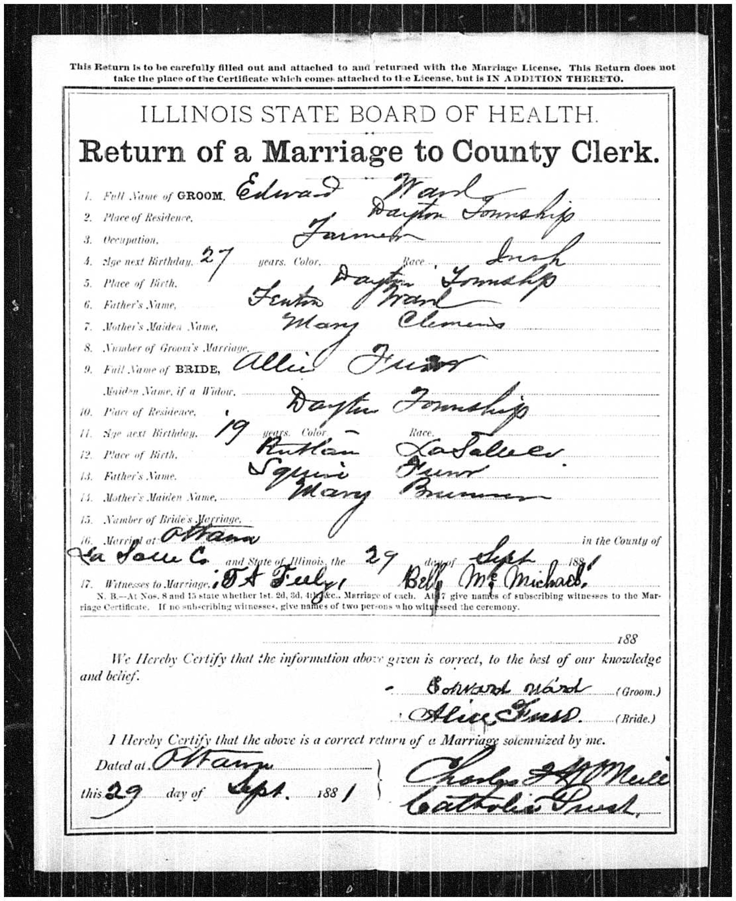 On September 29, 1881, Alice Virginia Furr married Edward Joseph Ward in Dayton. She was the daughter of Squire and Mary (Bruner) Furr. He was the son of Fenton and Mary (?) Ward. Although he lists his mother’s name as Mary Clemens in this marriage application, the 1842 La Salle County marriage of Fenting [sic] Ward lists his wife’s name as Mary Cofield. Further investigation is needed on this.