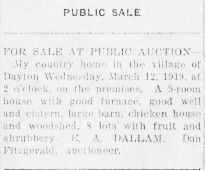 An upstairs bedroom in this house produced Dayton’s only newspaper. One of the sons, Charles, had a little printing press and he was editor, reporter, printer & everything and he called it “The Dayton Enterprise”. There is only one known copy.