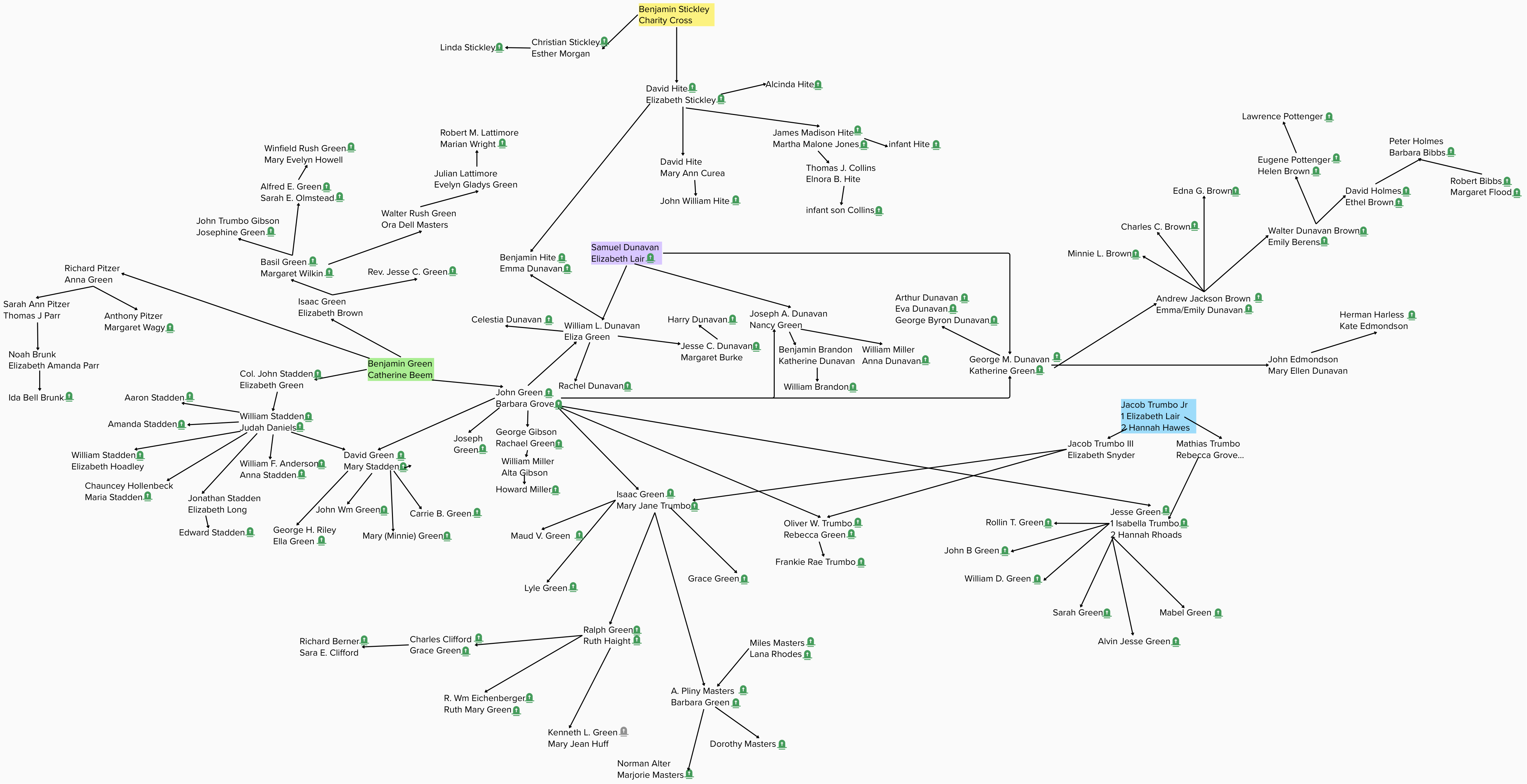 Knowing the family name is not enough to identify relatives. Many of the relationships center around the Green, Dunavan, Trumbo, and Stadden families but marriages have changed names and the connections are sometimes rather remote. For instance, little Ida Belle Brunk, on the extreme left, is a second cousin once removed of Mabel Green in the lower right hand corner. Both are direct descendants of Benjamin Green (green highlight).