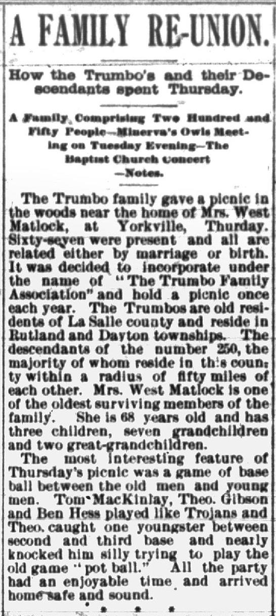 The Trumbo family gave a picnic in the woods near the home of Mrs. West Matlock, at Yorkville, Thursday. Sixty-seven were present and all are related either by marriage or birth. It was decided to incorporate under the name of “The Trumbo Family Association” and hold a picnic once each year. The Trumbos are old residents of La Salle county and reside in Rutland and Dayton townships. The descendants of the number 250, the majority of whom reside in this county within a radius of fifty miles of each other. Mrs. West Matlock is one of the oldest surviving members of the family. She is 68 years old and has three children, seven grandchildren and two great-grandchildren.