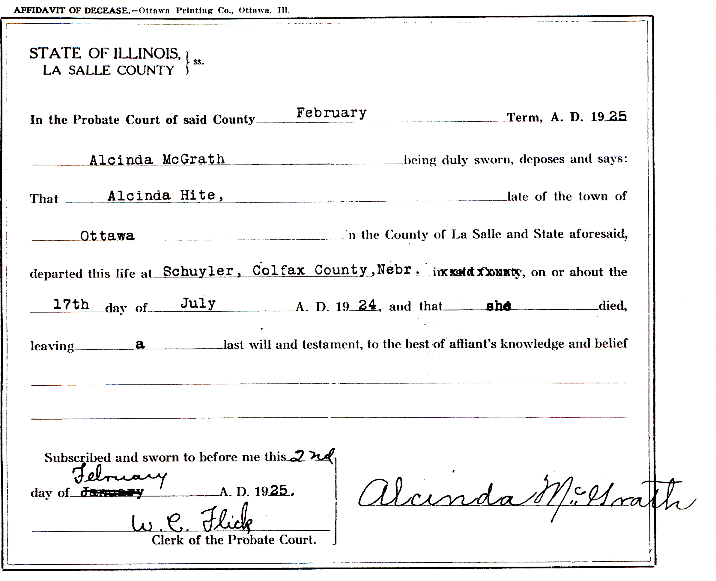 The body of Miss Alcinda Hite, 84 years of age, who died in Council Bluffs, Iowa, will arrive in Ottawa tomorrow morning. Funeral services will be held at 1:30 o’clock Sunday afternoon, at the Ottawa Baptist church. Interment will be made in the Dayton township cemetery.