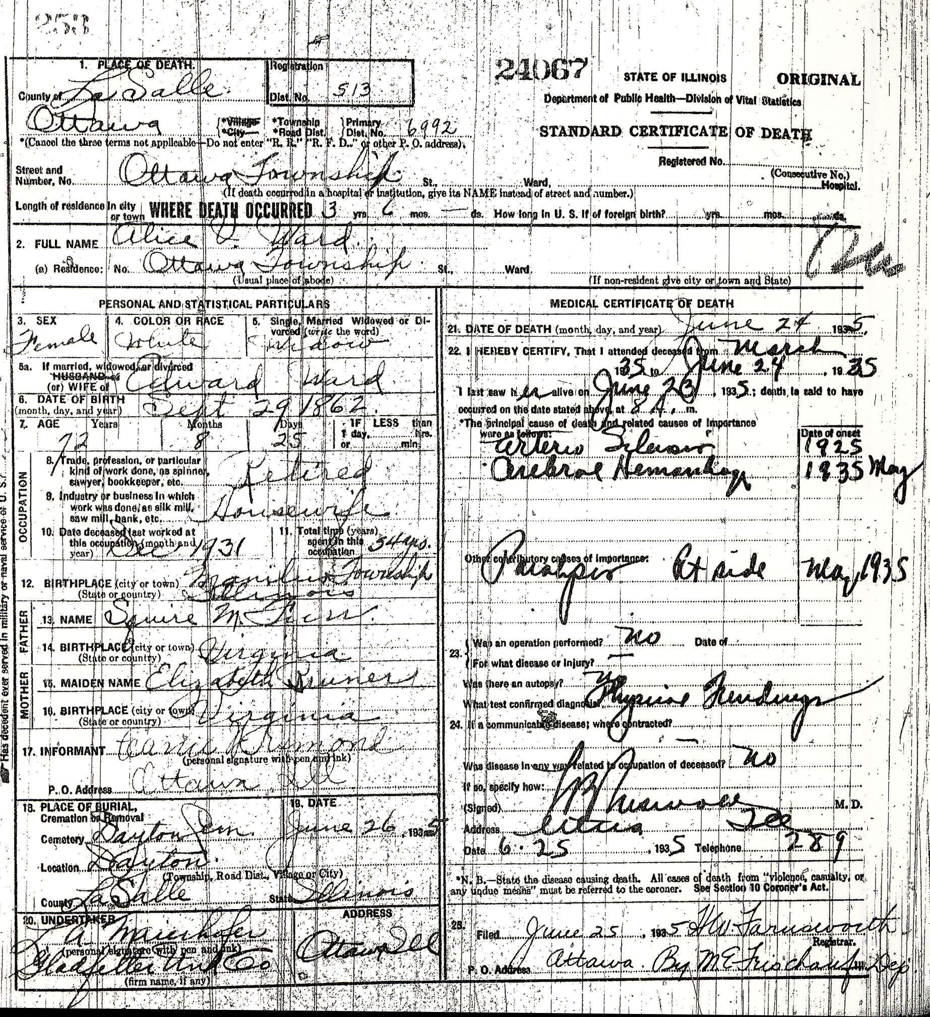 died June 24, 1935, in Ottawa township, La Salle county, Illinois