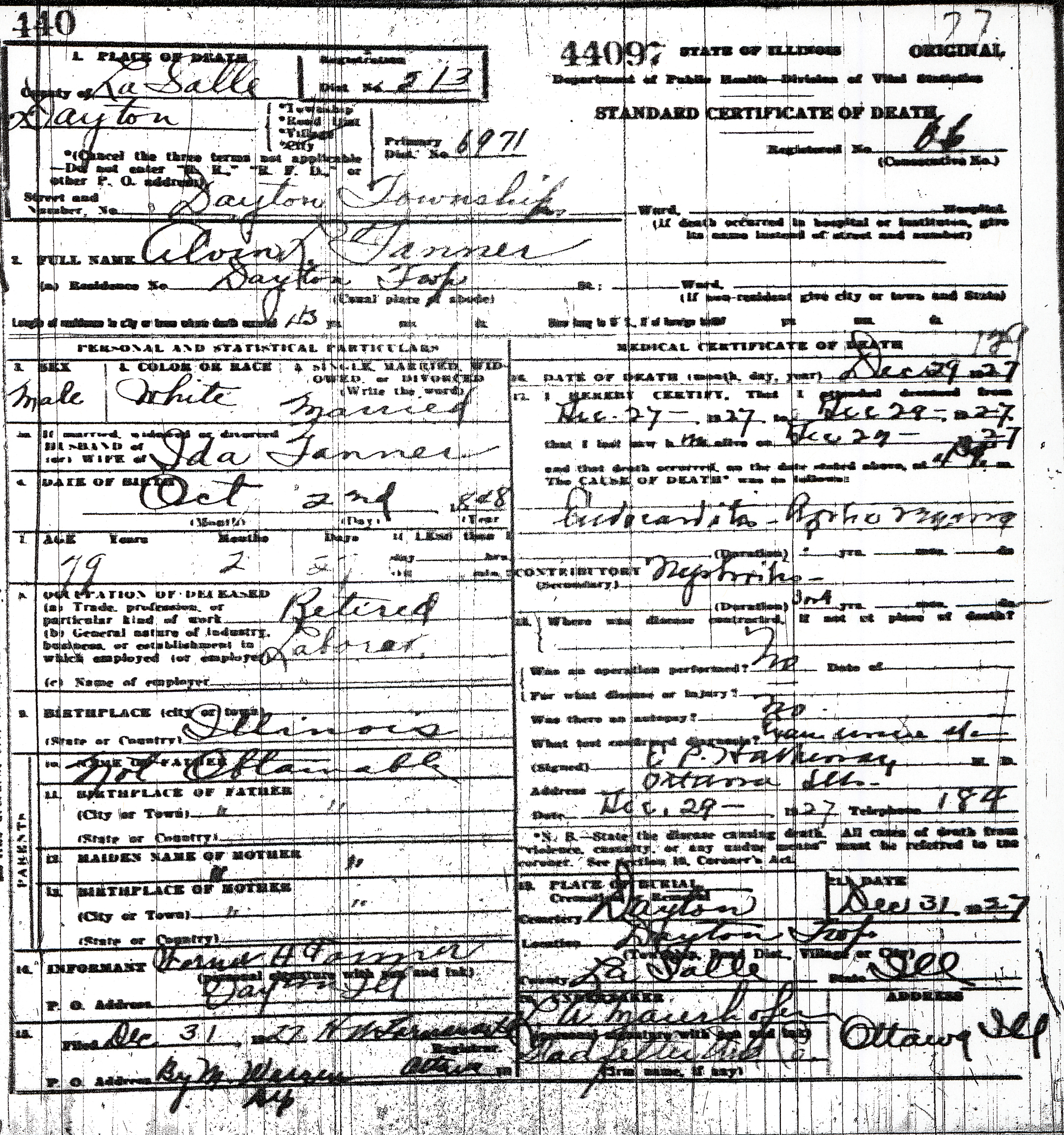 died December 29, 1927, in Dayton, Illinois