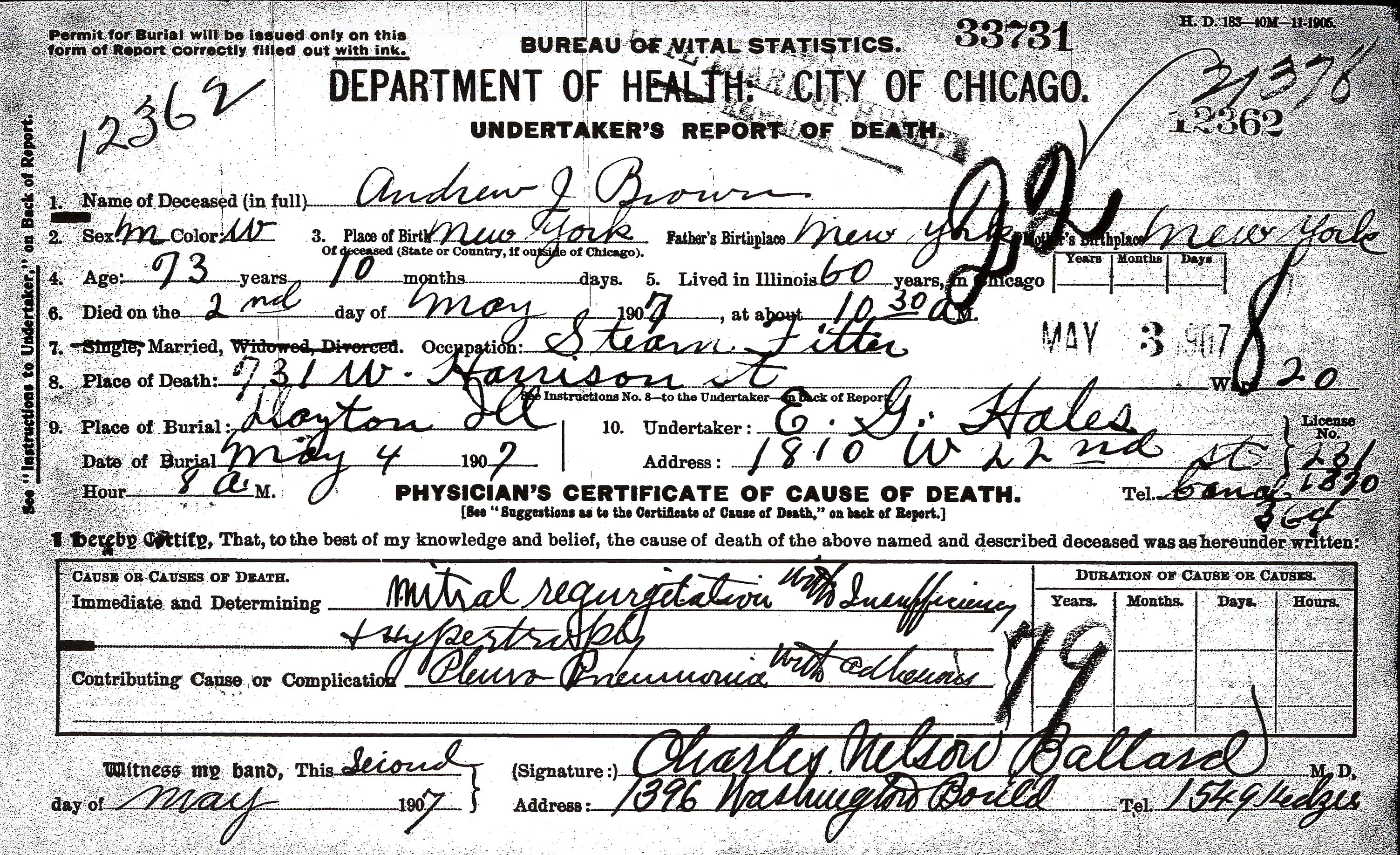 Andrew J. Brown died Thursday, May 2, at his residence in Chicago. He was a former resident of Ottawa, being associated with the late Frank King in the manufacture of pumps. He moved to Chicago in 1880 and with the exception of one year in Kansas, has resided in that city continuously since that time. Mr. Brown was born in Cattaraugus county and in 1865 was married to Emily M. Dunavan, who with three sons survive him.1