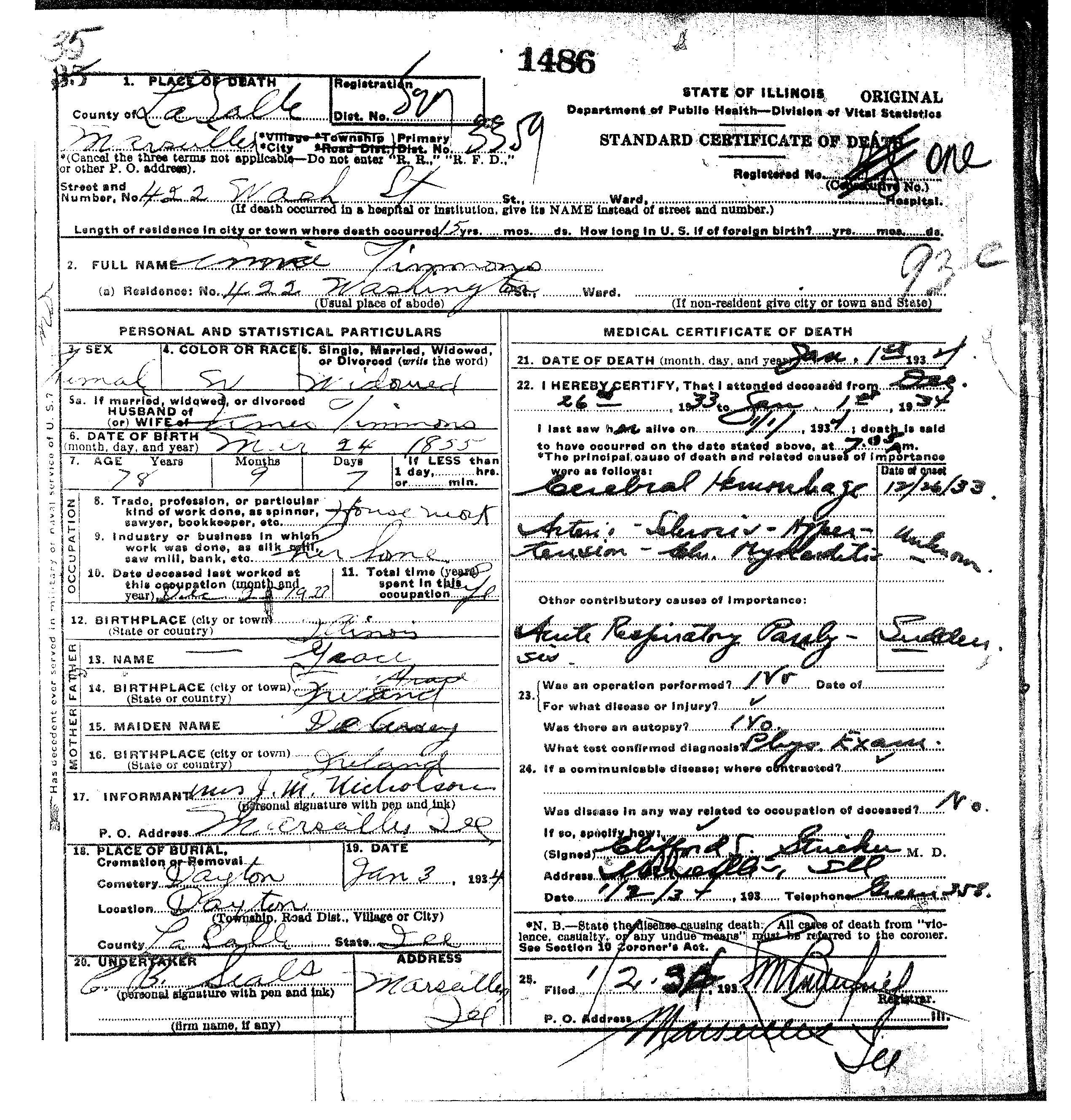 The decedent’s husband died in 1908 [sic], and is buried at Dayton. Mrs. Timmons is survived by two daughters, Mrs. John M. Nicholson and Mrs. Effie Fenton, both of Marseilles, one son, Harry Timmons of Moline, seven grandchildren and two great-grandchildren. She also leaves one half-brother, William Ryan of Waterloo, Ia.