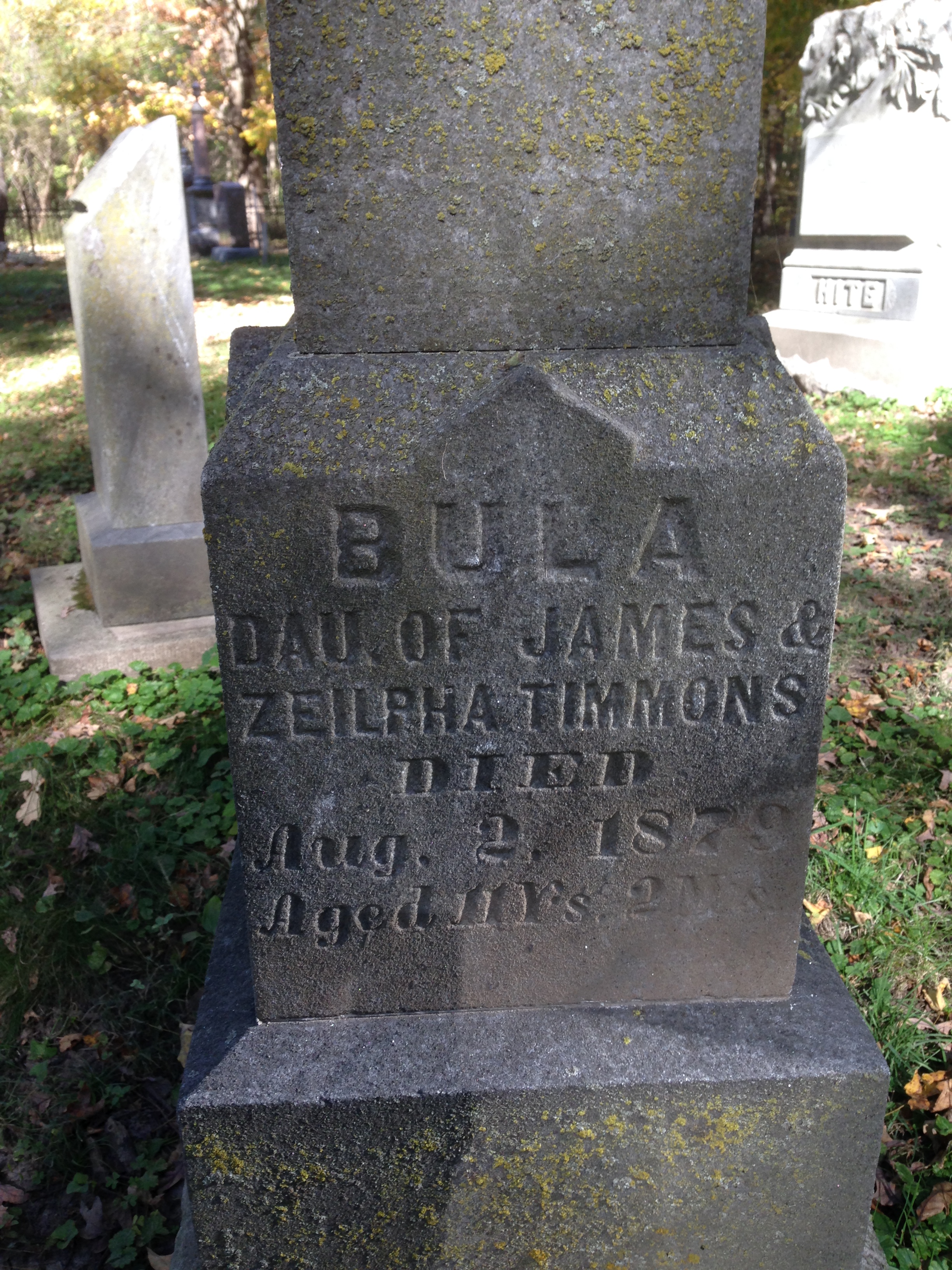 Bula Timmons Bula Timmons born about 1868 died August 2, 1879, in Dayton, Illinois Share this:Share Click to email a link to a friend (Opens in new window) Email Click to print (Opens in new window) Print Like Loading...