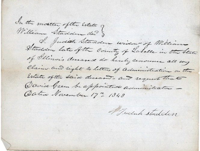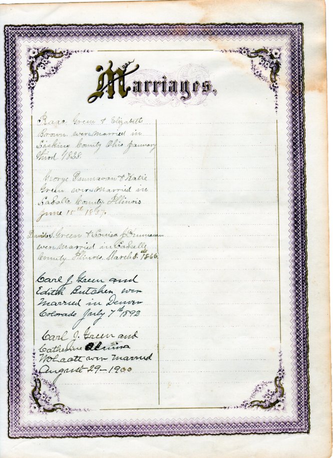 “We started from Licking county, Ohio, on the first of November, 1829, for the state of Illinois. There were 24 in the company. Father had gone to Illinois the September before we started and bought land. He and three other men rode on horseback around by Cleveland and along the lakes. When they reached Chicago, where there were only two families besides the garrison, father bought some provisions and in paying for them pulled out quite a roll of bills. That night his brother, Wm. Green, dreamed there were robbers coming and woke the others up, but they refused to start out in the night just for a dream, and he went to sleep again only to dream the same thing again, and when he had dreamed it three times he told them they could stay there if they wanted to, he was going to leave; so they all started and soon after they saw three men following for the purpose of stealing they [sic] money.