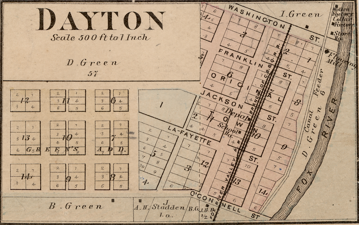 Dayton was settled in 1829 by a party of Ohio immigrants who saw riches in the water power of the Fox River. Mills were established to grind corn and wheat.