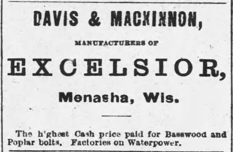 In 1878, Ira in company with a younger man, Duncan MacKinnon, formed the firm of Davis & MacKinnon, which became a successful producer of excelsior.  Ira  became a very prominent  business man in Menasha and was elected alderman from his ward.ad for Davis & MacKinnon