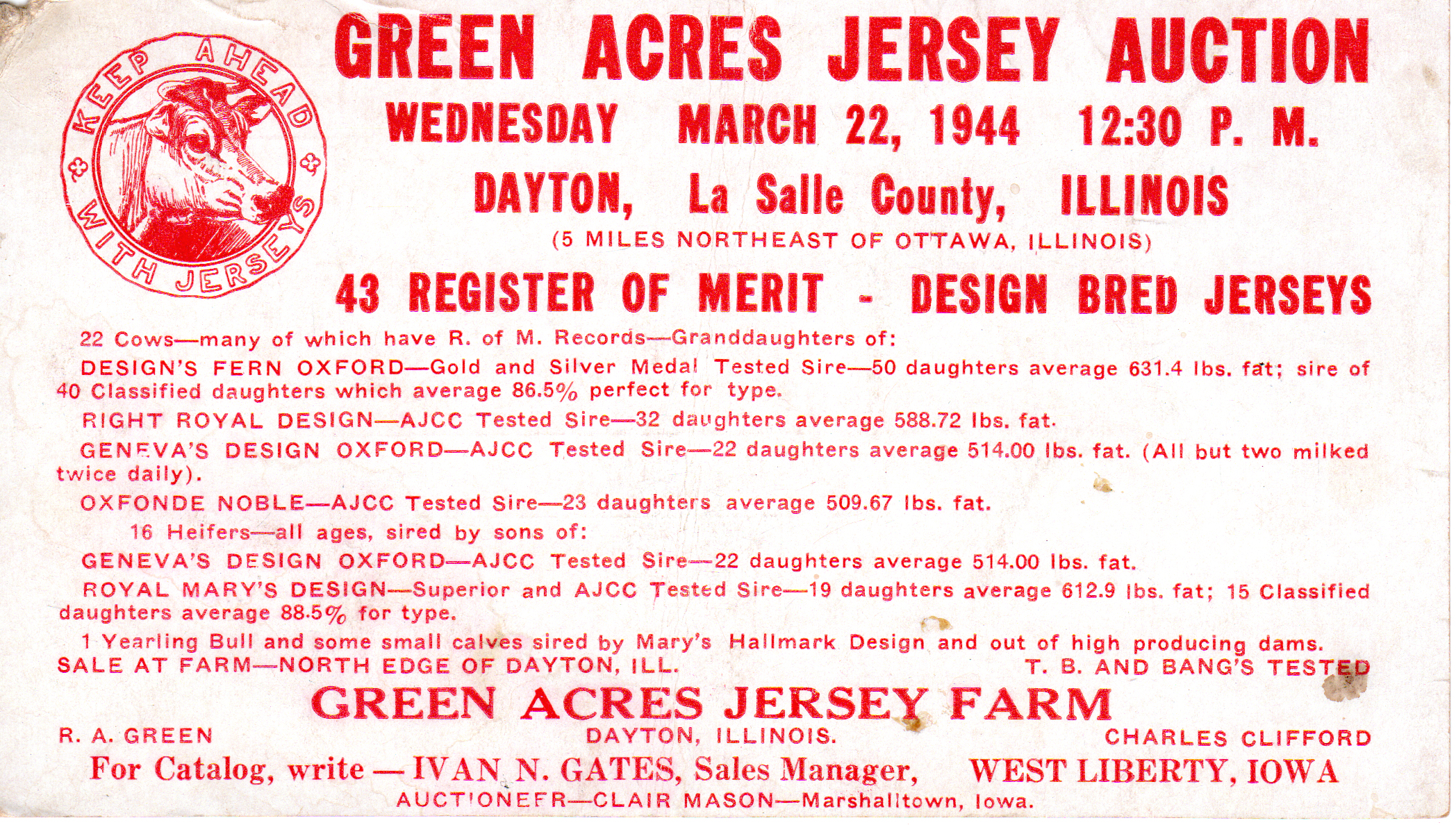 Farmers throughout the Dayton area sold their milk to the Dayton Dairy. In the early days of the twentieth century, the Green farm had one of the oldest Jersey herds in the state of Illinois. Lyle A. Green, who took over the farm on the death of his father, Isaac, upgraded the herd until many of the cows made their way into the Jersey Registry of Merit. He traveled, often into neighboring states, to purchase pedigreed stock to improve the herd. He became a breeder, building a good reputation for Greenacres Farm of Dayton, Illinois.