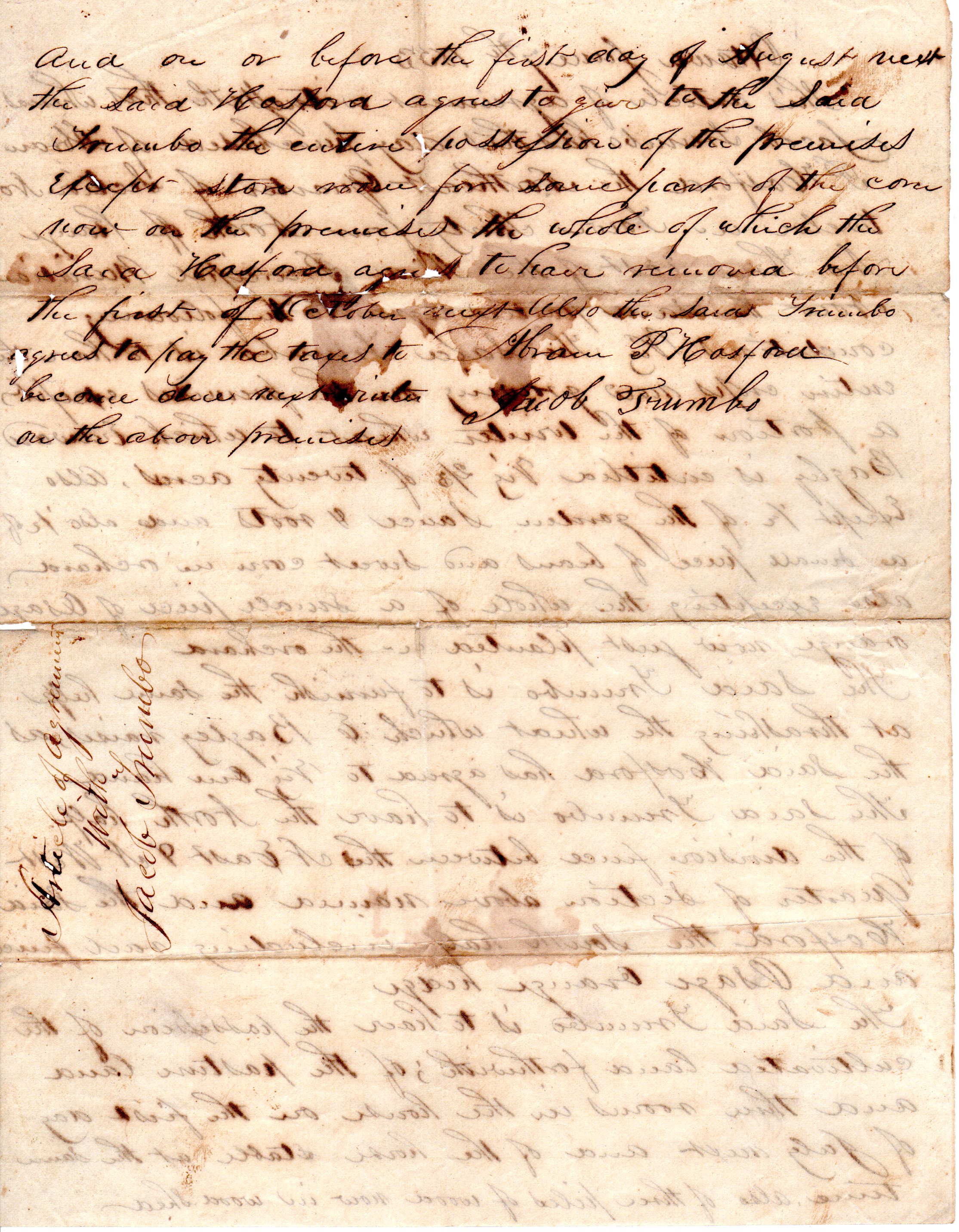 The said Trumbo is to have the possession of the cultivated land forthwith;  of the pasture land and three rooms in the house on the first day of July next and of the horse stable at the same time.  Also of three piles of wood now in wood shed and on or before the first day of August next the said Hosford agrees to give to the said Trumbo the entire possession of the premises except store room for some part of the corn now on the premises the whole of which the said Hosford agrees to have removed before the first of October next  Also the said Trumbo agrees to pay the taxes to become due next winter on the above premises.