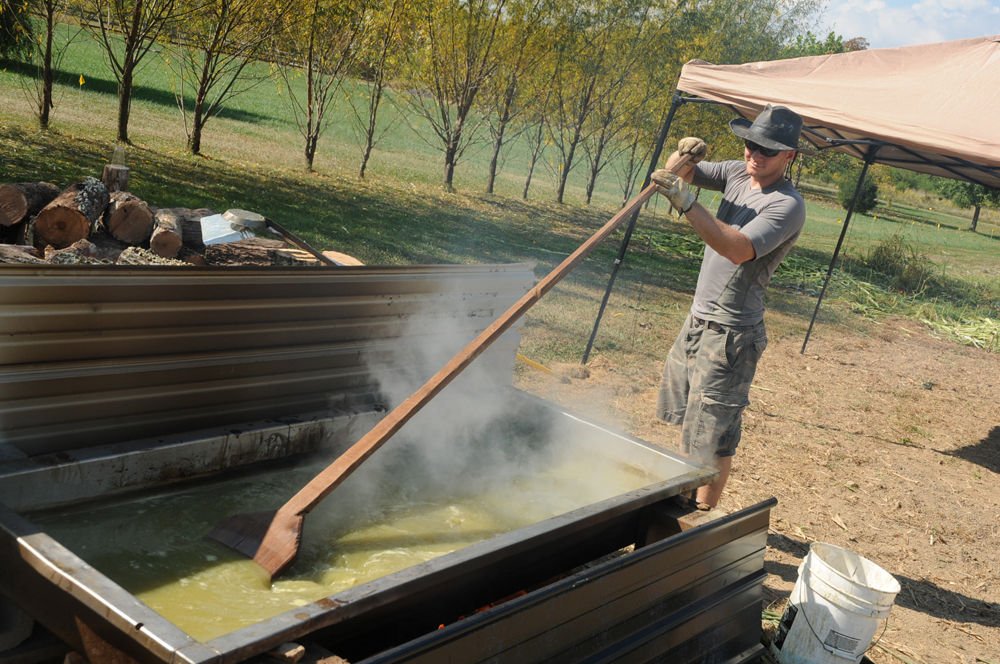 William Rexroat is chief cooker. Two men skim off the scum which forms on the top of the sorghum as it is cooked in the huge vat, after being crushed in the old fashioned mill.