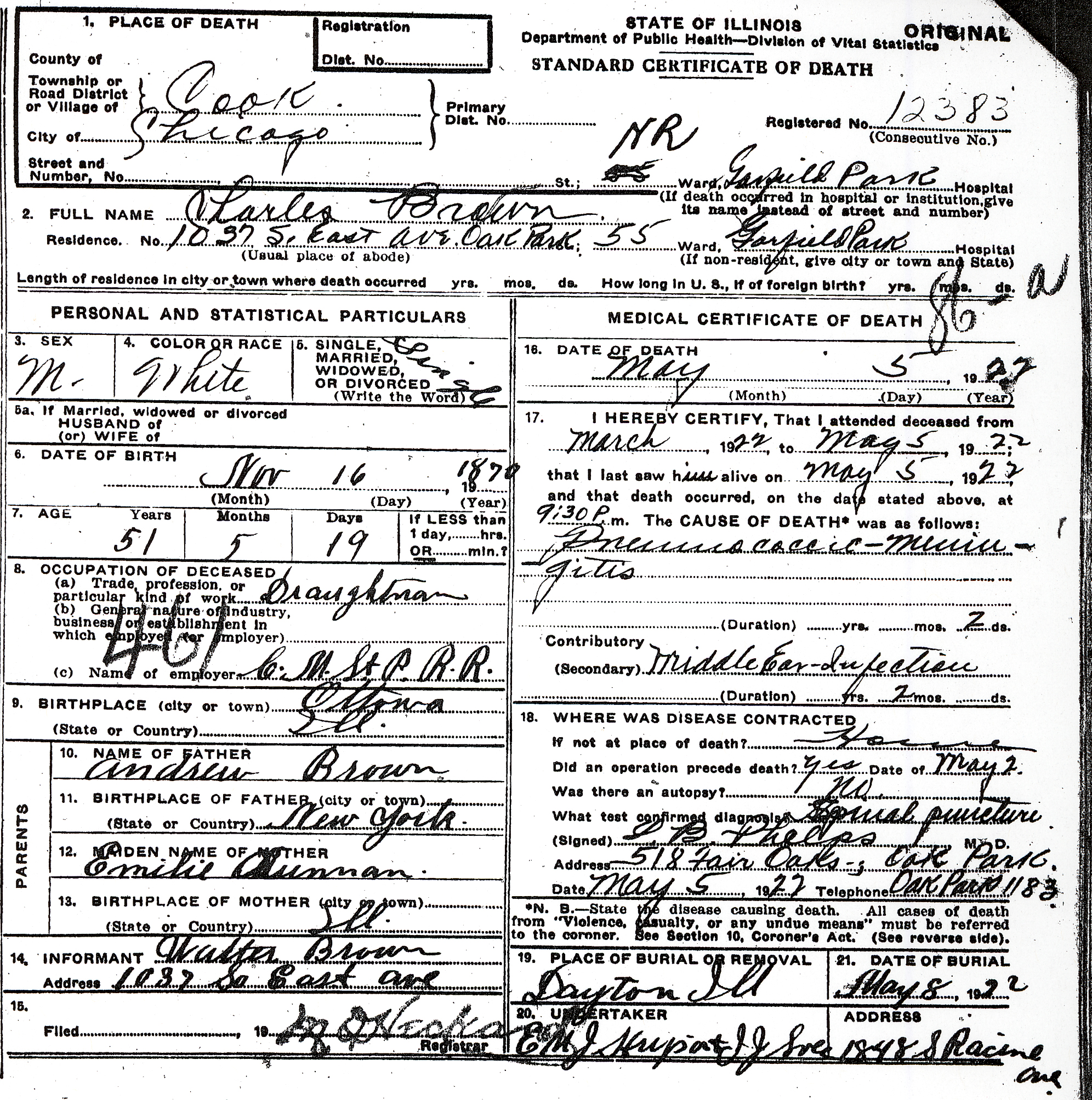 Charles C. Brown Charles C. Brown born November 16, 1870, in Ottawa, Illinois died May 5, 1922, in Chicago, Illinois Share this:Share Click to email a link to a friend (Opens in new window) Email Click to print (Opens in new window) Print Like Loading...