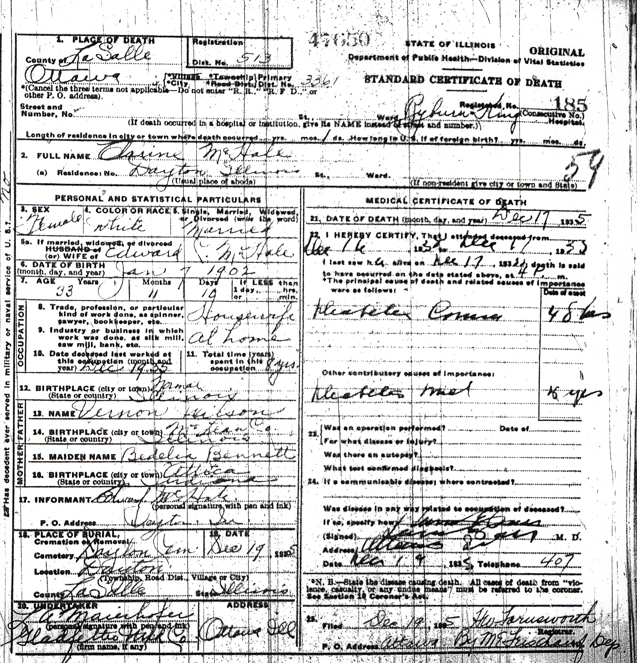 Mrs. McHale, whose maiden name was Clarine Wilson, was the daughter of Mr. and Mrs. Vernon Wilson and was born in Normal January 7, 1902. She had lived in the vicinity of Dayton for 30 years.