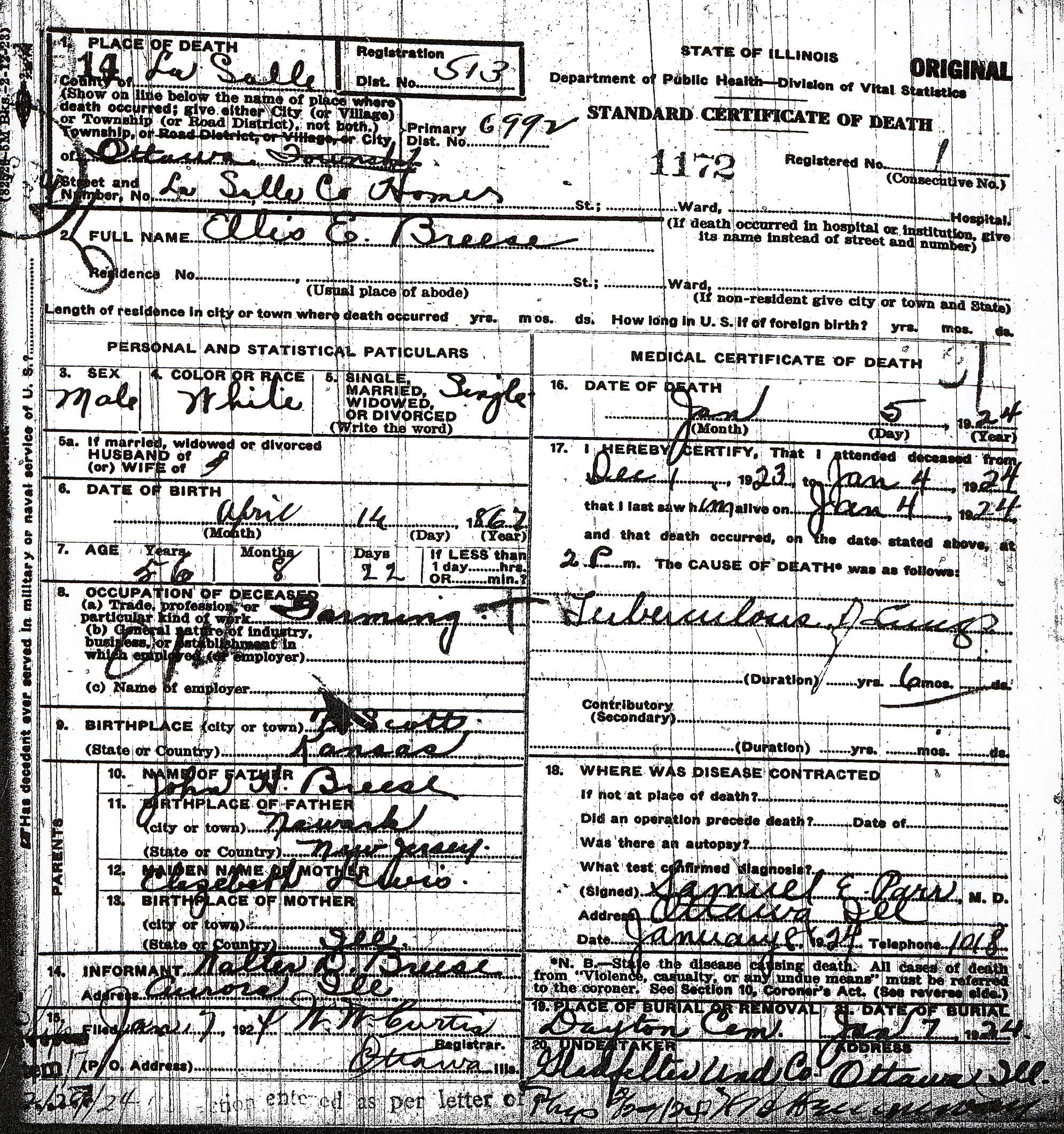 died January 5, 1924, in Ottawa, Illinois
