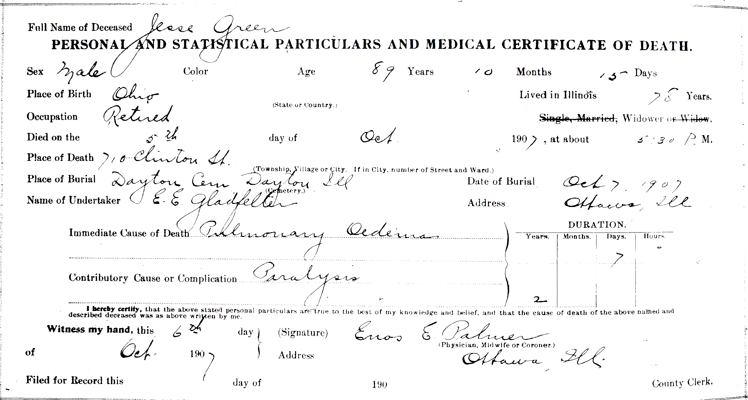 Jesse Green, the oldest resident of La Salle county, died at the Ryburn hospital on Saturday evening, October 5, after an illness of several months, and had he lived until Dec. 21 he would have been ninety years of age. Mr. Green was born in Newark, Ohio, Dec. 21, 1817. In 1849 in company with forty-eight others he started for California, leaving here April 2 and reaching his destination September 2. He remained in California two years and then returned to La Salle county and has resided here ever since, the greater portion of the time being spent at Dyton [sic].