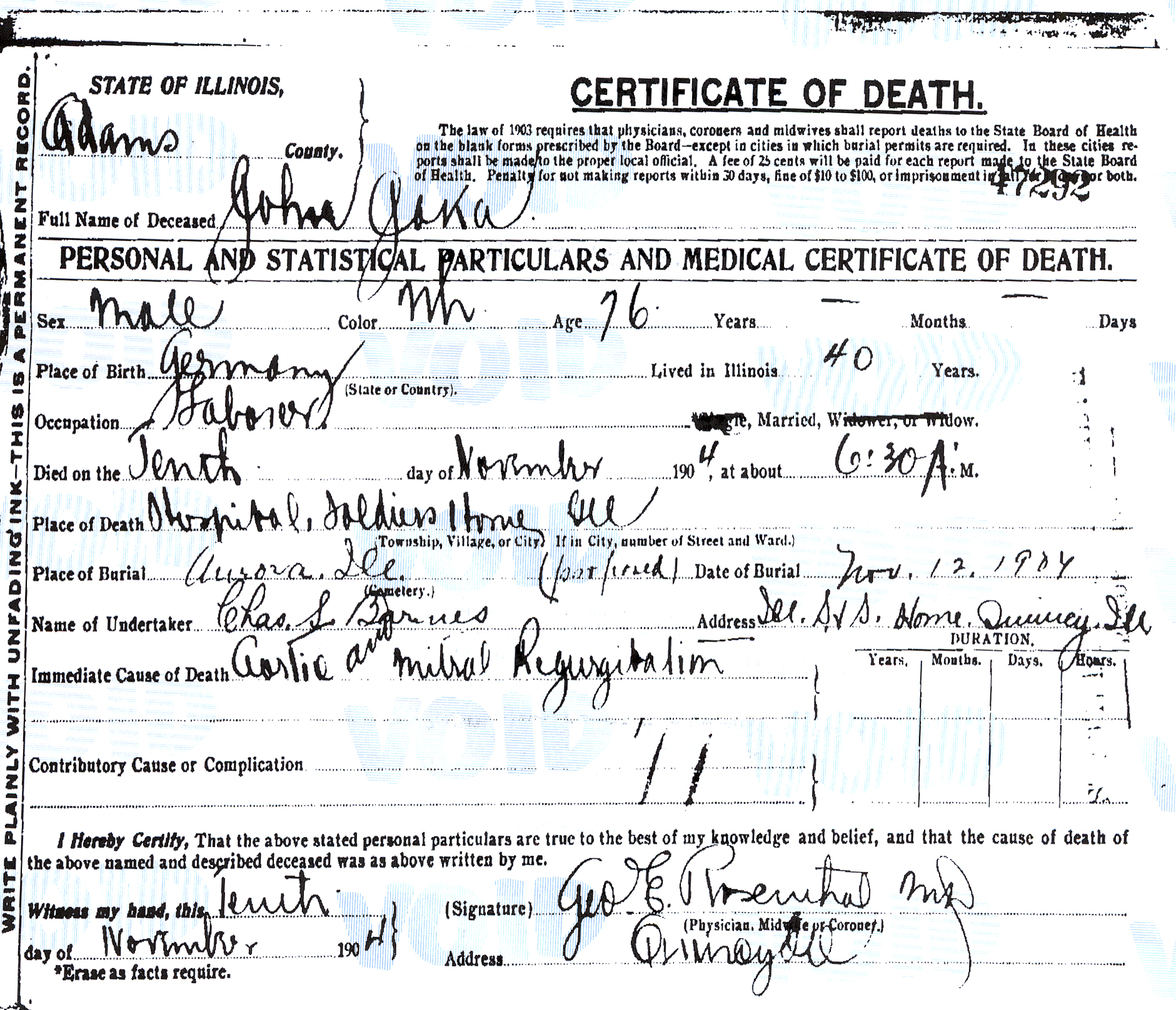 John Jaka, an old resident of Dayton township, died recently at the Soldiers’ Home at Quincy, Ill., of heart trouble. Mr. Jaka was a native of Germany. He enlisted in the Ninth Illinois Infantry in August, 1861, and served as a private until September, 1863. He has one son in the military service in the Philippine islands and one on a farm in Dayton township. He was over 70 years of age.1