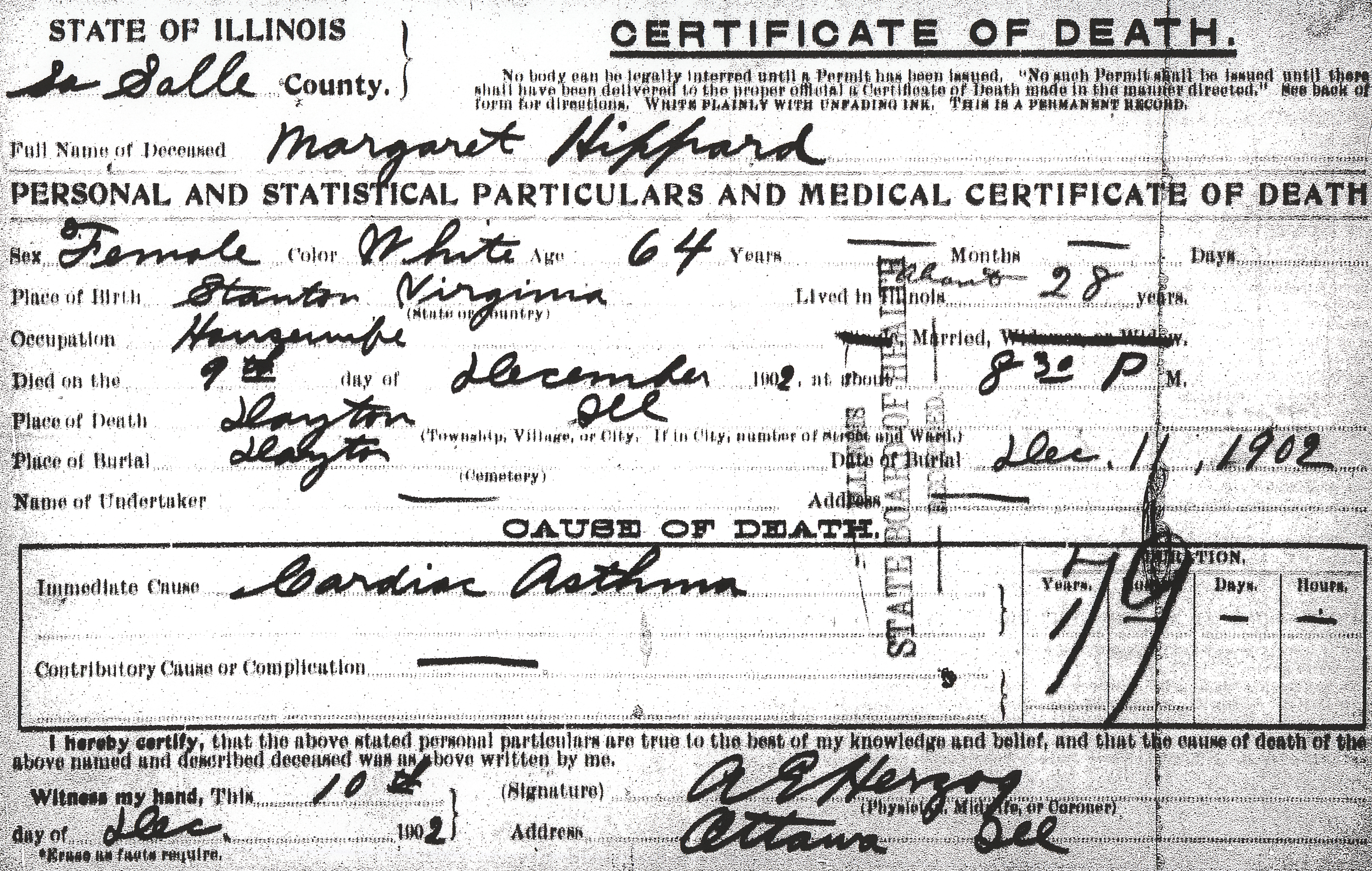 A very sudden death occurred here Tuesday night, Mrs. Tom Hippard, who has lived here for many a year. She was feeling quite well at supper time and helped do up supper work. She was taken sick and a physician was sent for but before the physician reached her she was dead. She was a kind neighbor and liked by all who knew her. She leaves surviving her besides her husband, two daughters, Sue of this place, and Lue of Chicago, one son John and one brother, George Stover. The funeral took place from the home Thursday at 10 o’clock. Interment in Dayton cemetery.