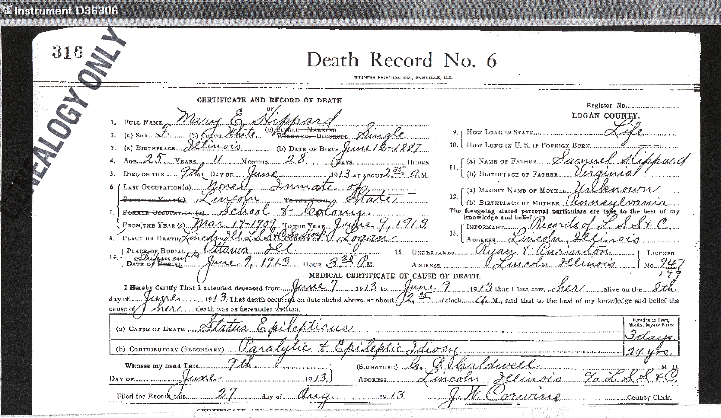 Although the death certificate says buried in Ottawa, the records of the Gladfelter funeral home, which is located in Ottawa, say that she is buried in Dayton. Since her death occurred in Logan county, the remains would have been transferred from there to Ottawa, The death certificate, therefore, reflects the disposition of the body from Logan county, and not its ultimate destination.