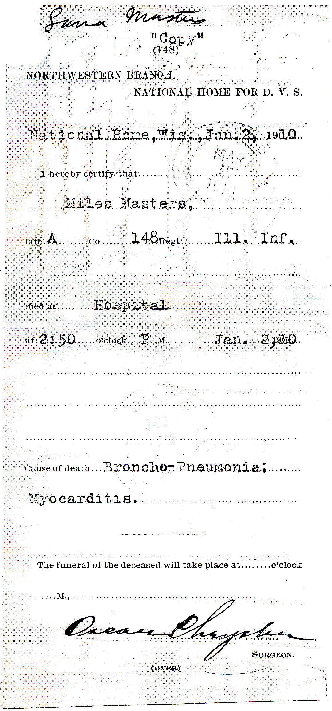 The funeral services of Miles Masters, late of Chicago, were held at the residence of his daughter, Mrs. Rush Green in Dayton at 2 p. m. Wednesday, the remains arriving from Chicago on the morning train that day. Mr. Masters was 63 years old and the immediate cause of his death was general debility. Besides his widow he leaves two sons, Gilbert, of Missouri, and Pliny of Minnesota, and three daughters, Mrs. William H. Holmes and Mrs. Henry Weigand, both of Chicago and Mrs. Rush Sweeney [sic, Green] of Dayton.