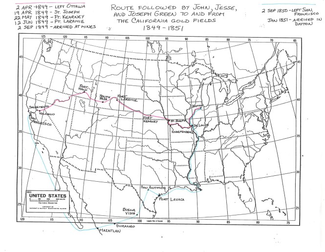 April 2, 1849: Twenty wagons and forty-nine men, principally from Dayton, but some from Ottawa, left by boat from Ottawa for the California gold fields. Jesse Green was elected captain of the company; Joseph Green, his younger brother, was among the company. John Green, their father, had been hired by the company to go with them as far as St. Joseph, MO to buy the oxen for the journey.