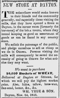 There has always been a store in Dayton, from the earliest days, but there have been various locations for it. Sometimes it was only a room in another building. The first few stores were between the mills, on the riverfront. Later stores were more centrally located in the village. The last store closed in the 1960s; the building is now a tavern.